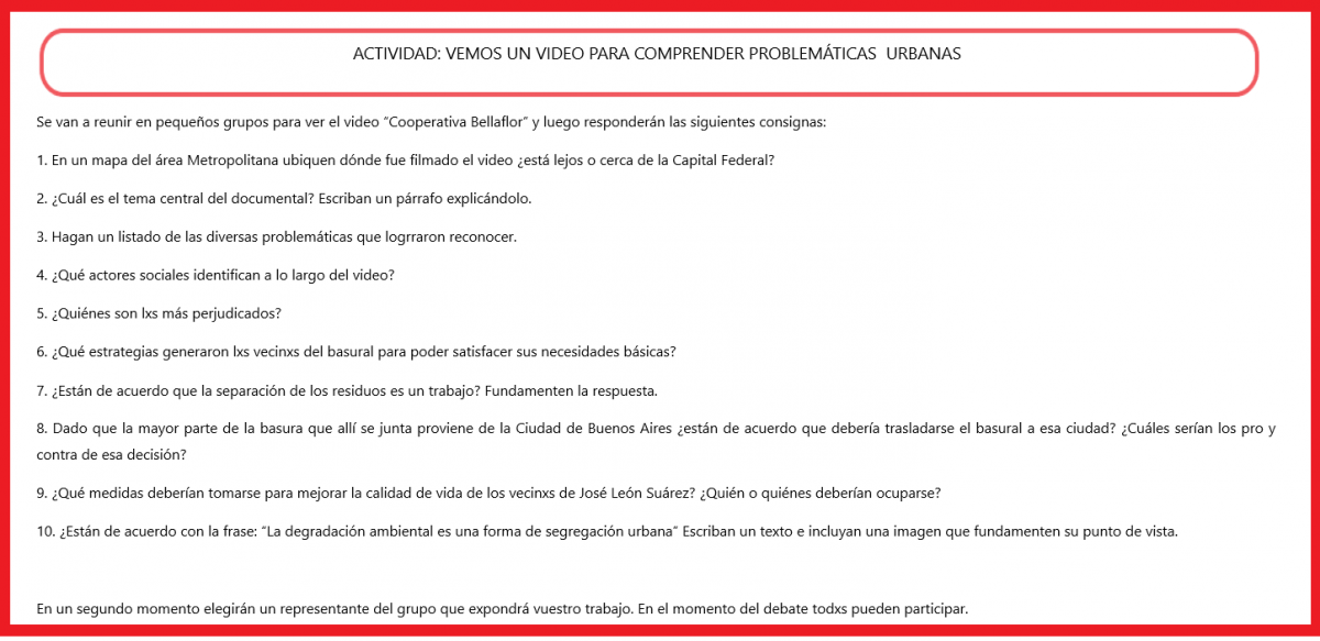Las respuestas dadas a la consigna 2 pondrán en evidencia de qué modo cada grupo ha “leído” el video e identificado el tema que más les impactó. En la puesta en común en grupo total seguramente surgirán las diferencias y cada docente hará las puntualizaciones que sean necesarias. La consigna 3 busca complejizar el caso haciendo foco en la identificación de las múltiples problemáticas que se pueden ver: sociales, ambientales, sanitarias, laborales, entre otras.